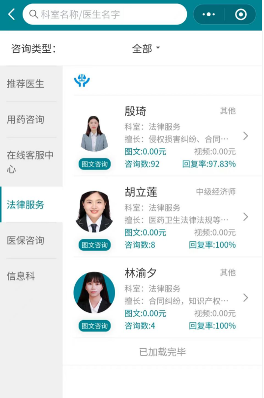 依托医院互联网智慧医院平台,创新性开展线上公益法律咨询服务,作为为人民群众办实事的有力举措之一。咨询工作过程中,利用科室专业优势,为医院医护人员及就医群众解答各类法律问题,宣传法律知识,提高大众的法律意识。