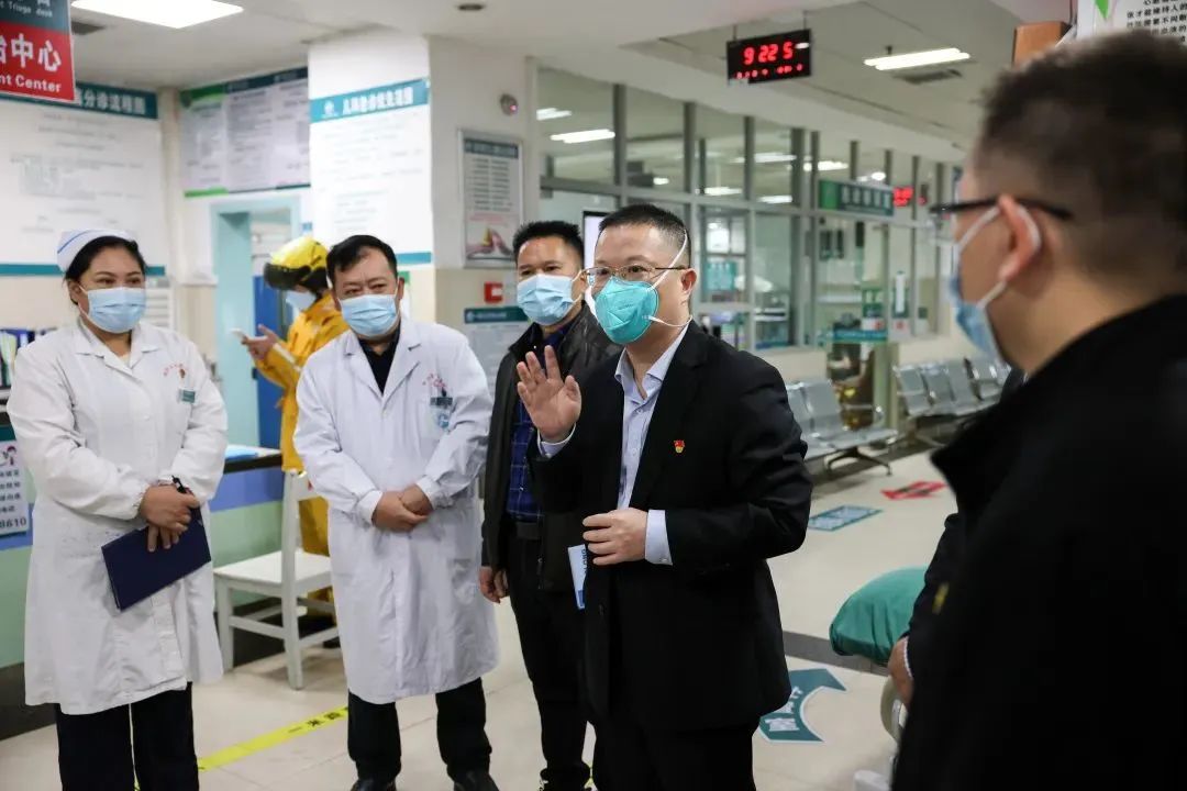 院党委书记李兵(右2)在柳江区人民医院调研指导新冠救治工作。