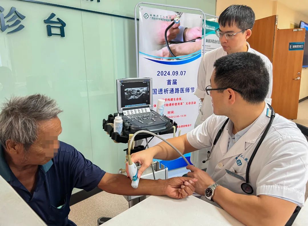 为确保血液透析顺利进行,我们的通路医师会定期为患者进行内瘘的 B 超检查,并由护士协助将检查信息录入信息系统。若在日常透析过程中,护士发现患者出现动脉或静脉压力过大的情况,会立即邀请通路医师来到床旁进行 B 超检查。通过 B 超检查,我们能够及时发现是否存在血管狭窄、血栓形成、血管瘤或血管通路堵塞等问题,并对可能出现的血管问题进行提前干预,从而有效延长透析通路的使用寿命。