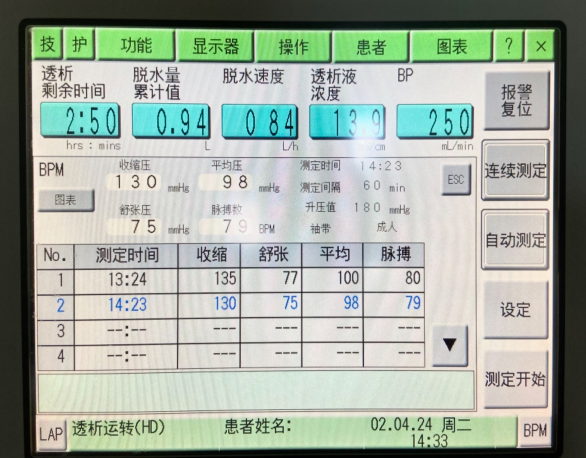 2022 年,我院引进高智能化的透析设备,实现了全自动预充、自动引血、自动回血等功能,极大地减轻了护士的工作量,为患者提供了更好的服务。该设备双通道实时监测患者相对血容量变化,结合血容量减少和透析后血管充盈程度以及临床评估,有助于干体重的评估。同时,我们还对旧透析机进行了升级,实现一机一血压监测,不但能实时监测血压变化,还可减少交叉感染风险。