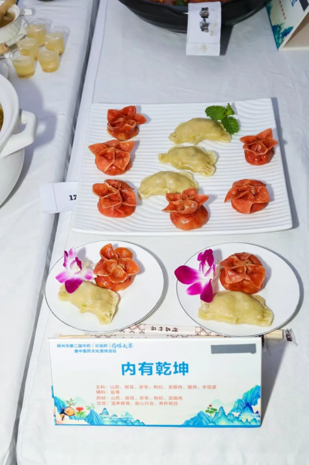 《如花似玉》是一款凉粉,功效是清热祛湿、健脾养胃,药材有名方四神汤(山药、茯苓、芡实、莲子)加上桂十味罗汉果,另有薏苡仁加强祛湿减肥功效。《妙“手”生花》这道药膳,其中有黄精、党参、白术、生地这些滋阴润燥药材,帮助通润肠道,补气养阴、健脾润肺,而猪肘富含胶原蛋白,再配上桂十味的肉桂,引火归元,从而达到排毒养颜的功效。《驻红却白》汤中含有鸡血藤、白茅根、大枣等药材,能够活血补血、清热凉血。《内有乾坤》饺子馅里有银耳、枸杞、山药、茯苓、桂十味和龙眼肉,配上猪肉,可以温养脾胃、补心血、养肝血。