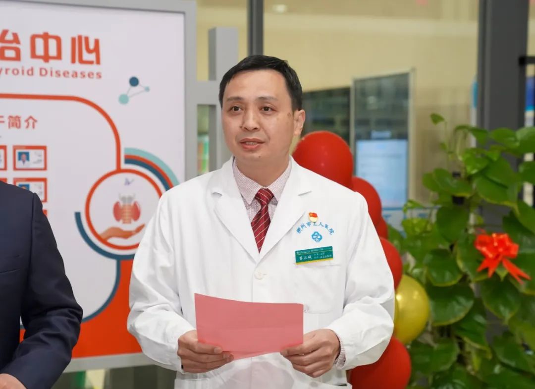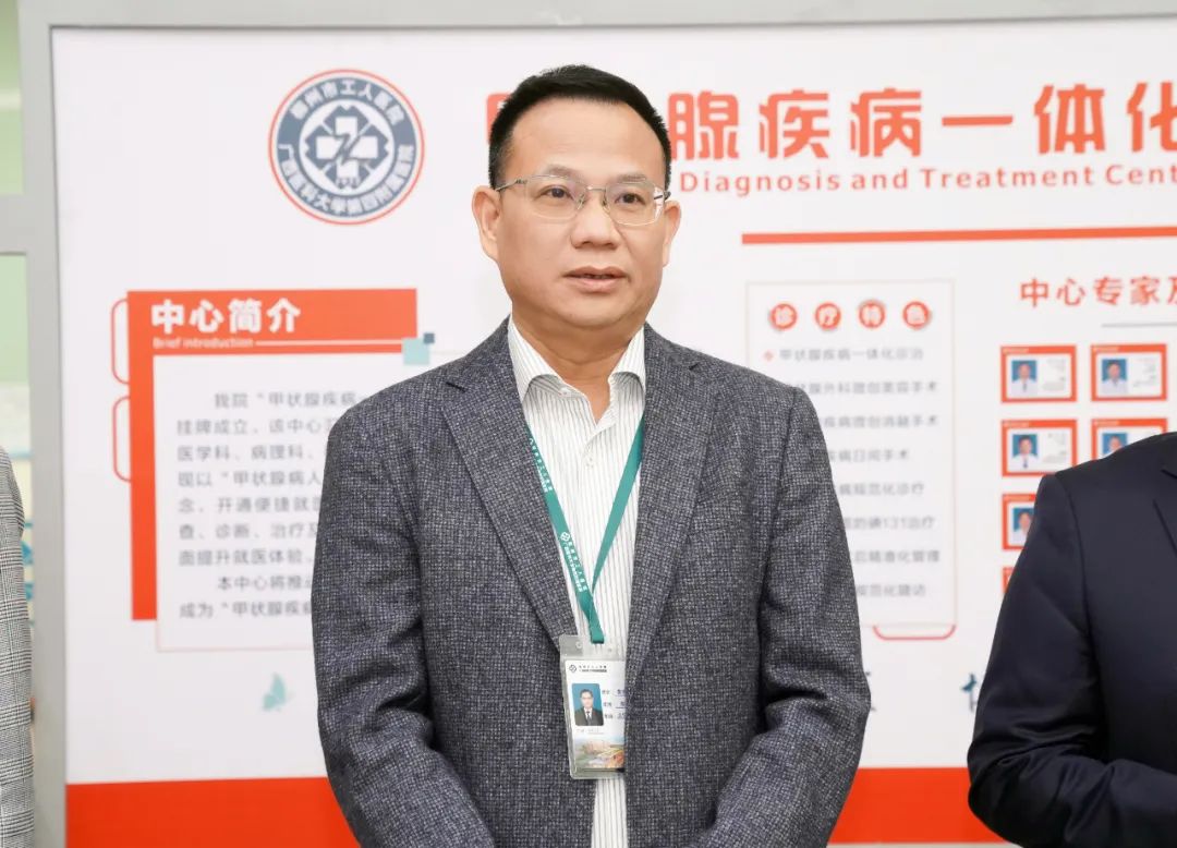 柳州市工人医院院长黄海欣对“甲状腺疾病一体化诊治中心”的成立表示祝贺,他表示一体化诊治并不单是流程改变,更是学科的融合。希望中心成立后各参与科室要竭尽所能,发挥团队优势,要发挥“1+1>2”的作用,不断优化诊治流程,为患者提供优质、便捷、高效的诊疗服务,实现为甲状腺疾病患者提供标准化、规范化和中心化诊治,借此契机推动我院全方位、全生命周期健康管理模式及多学科联动的疾病诊治体系的建立,也希望大家继续蓄势能、育动力,推动一体化诊治中心建设发展横向整合、纵向深入,全面提升我院甲状腺疾病的综合诊治能力,造福更多甲状腺疾病患者,为成为“甲状腺疾病区域医学中心”而不断努力!