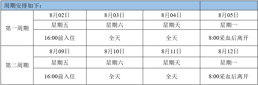 (2)每位志愿者需要完成2个周期项目,体格筛查前3天需保证良好的生活作息和饮食习惯(如早睡、不做剧烈运动、不大量食用海鲜、动物内脏等);