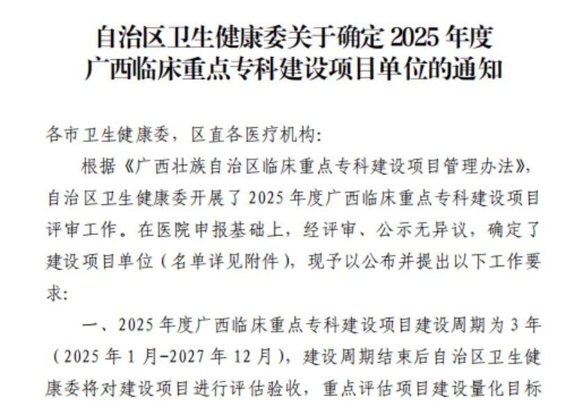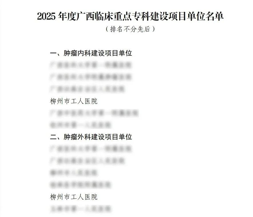 近日,自治区卫生健康委下发《自治区卫生健康委关于确定2025年度广西临床重点专科建设项目单位的通知》,经评审、公示无异议,确定柳州市工人医院肿瘤外科、肿瘤内科、神经内科为广西临床重点专科建设项目。
