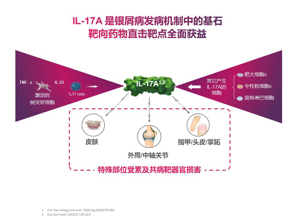 现在生物制剂治疗有了新的发展。最新研究发现,亚洲患者皮损中白介素17A (IL-17A)的水平显著高于其他细胞因子,且高于西方患者。以IL-17A为靶向的生物制剂治疗将有效改善银屑病患者皮损、特殊部位受累和共病靶器官损害,其中司库奇尤单抗治疗的5年长期安全性良好,接近100%的患者维持病情缓解长达5年。