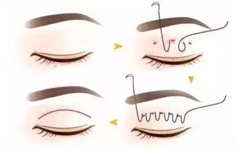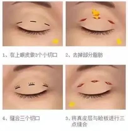 在上睑皮肤上做三个不连续的微小切口,然后把每个切口缝合固定,形成双眼皮。必要的话可以在这个三个小切口抽出少量的脂肪。术后效果相对稳定,创伤相对较小,不过该方法只能去除小切口内的部分皮下组织,也不适合上睑皮肤明显松弛的人群。