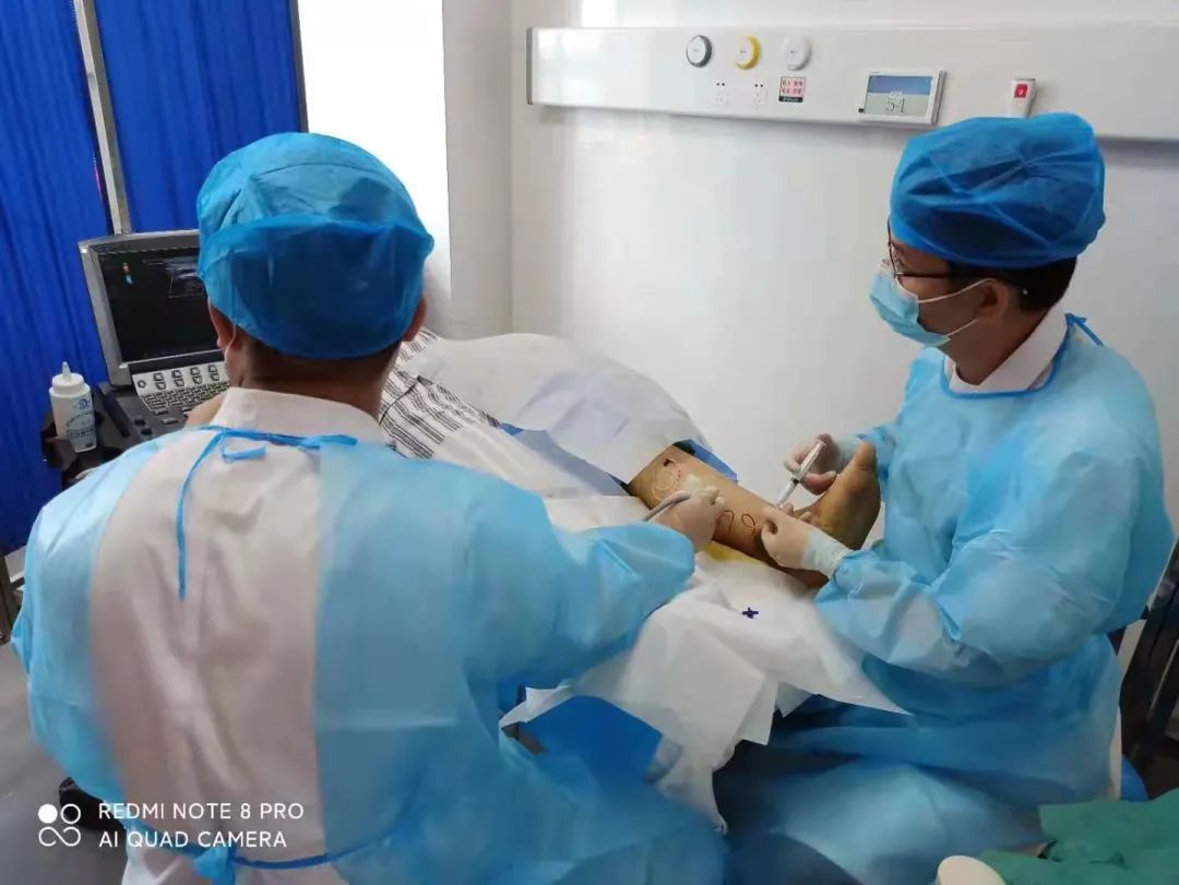 治疗在病房的处置室里进行,血管外科介入团队的许太福博士、张科主治医师通过床边便携式超声进行曲张静脉的定位,尤其是主要返流静脉及穿透静脉的标记;再根据患者病变范围头皮针穿刺并留置(多点穿刺);制备泡沫硬化剂;在彩超引导下经头皮针注入泡沫硬化剂,使硬化剂在曲张静脉中均匀并完全的弥散,最后局部加压包扎,手术时长不足20分钟,患者术后即可下床。