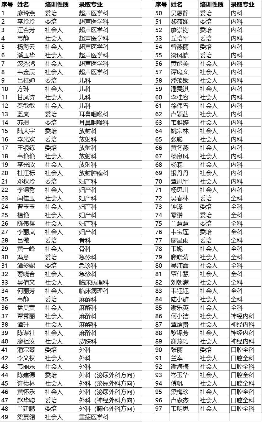 柳州市工人医院2021年第一批 住院医师规范化培训招生拟录取名单公示