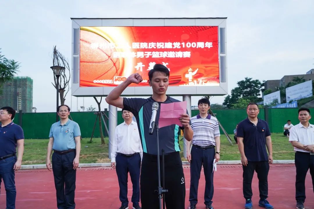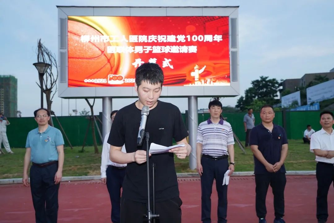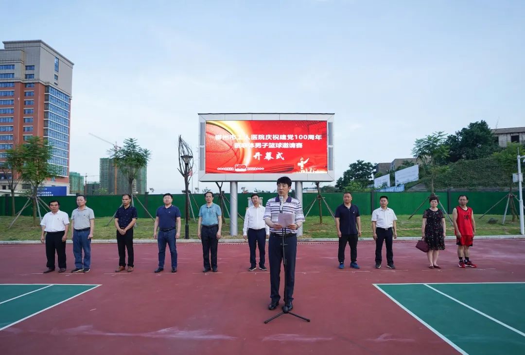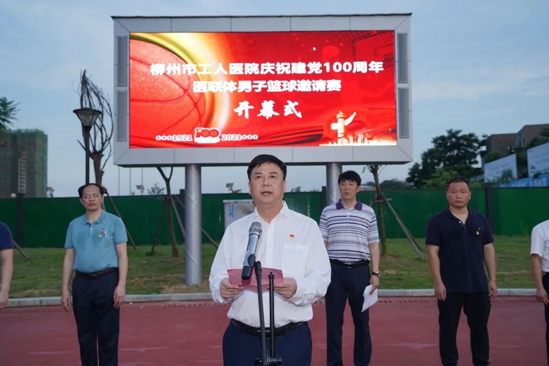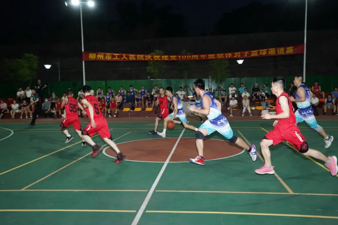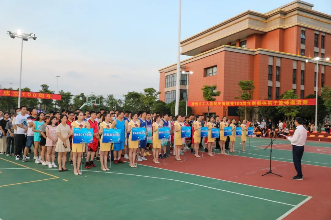 柳州市工人医院庆祝中国共产党成立100周年医联体男子篮球邀请赛,6月18日晚,在新总院篮球场正式开幕。9支医联体医院代表队将在为期6天的比赛中展开交流和角逐。