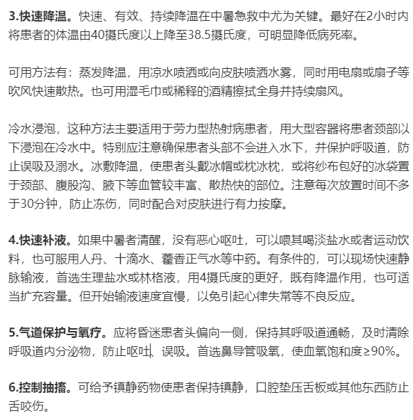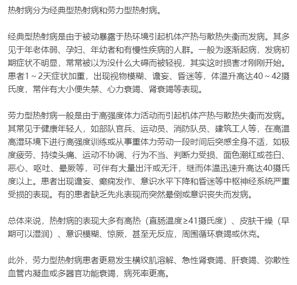 特别值得注意的是,重症中暑包括热痉挛、热衰竭和热射病三种,不同种类的中暑表现不同。