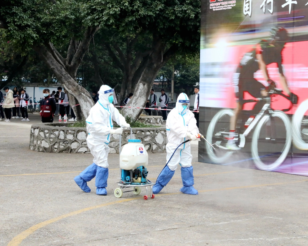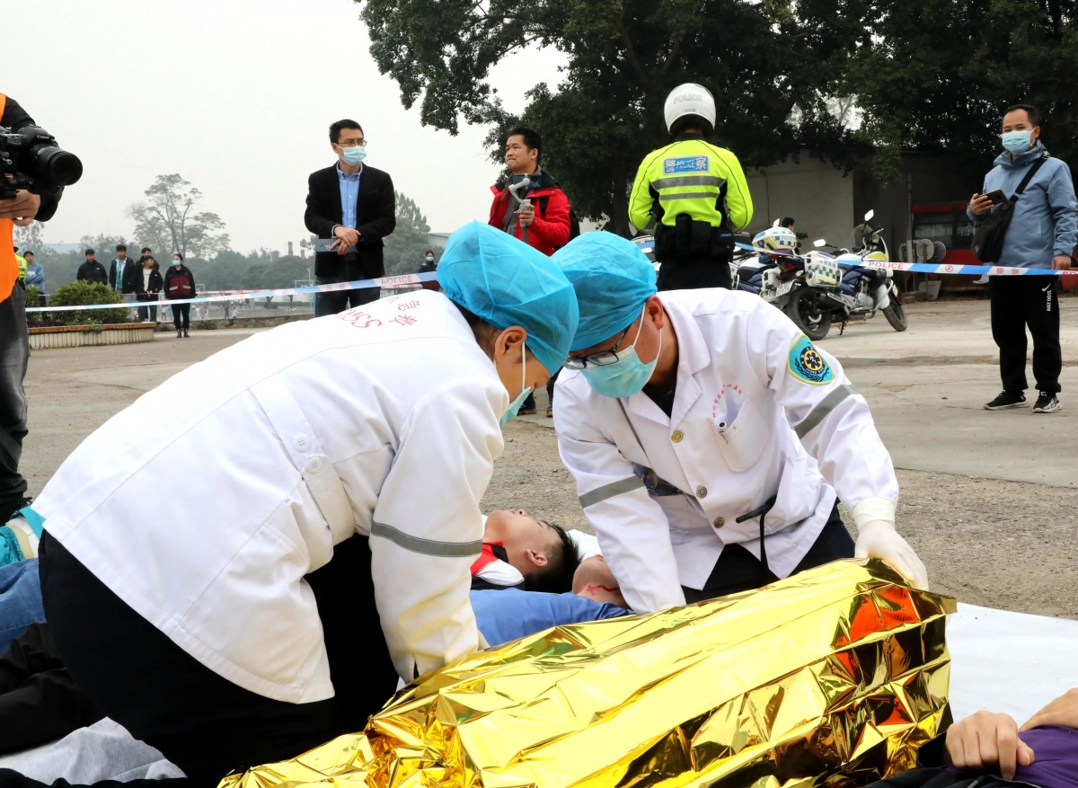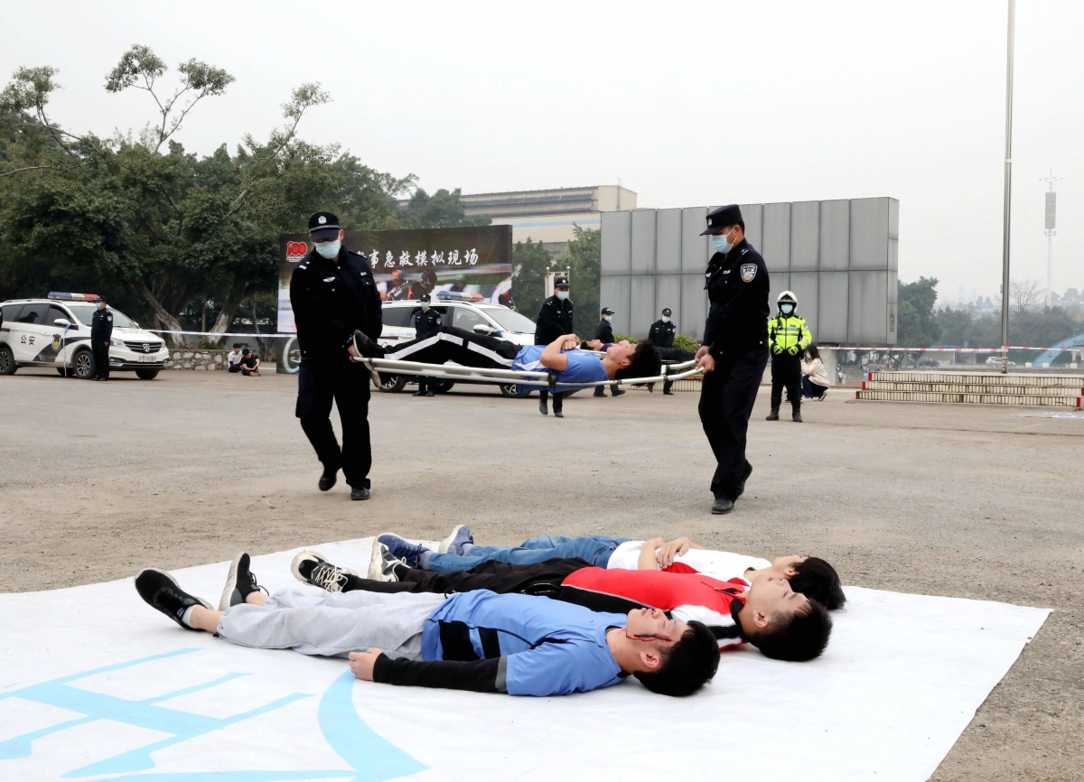 演练共分为两个现场进行,第一现场在柳州市交通学校。9:30分,演练正式开始。演练模拟了环广西公路自行车赛巡回赛(柳州站)太阳村路段,在比赛过程中,1名选手因操作失控与前面的选手相撞摔倒,导致后面十几名选手刹车不及相继追尾相撞并碾压踩踏,由于车速过快、人员众多,场面混乱,伤情严重,伴随着大风开始降雨,部分伤员出现了失温症状。现场备勤急救点太阳村镇卫生院医生立即拨打市120急救指挥中心电话报警并请求增援。