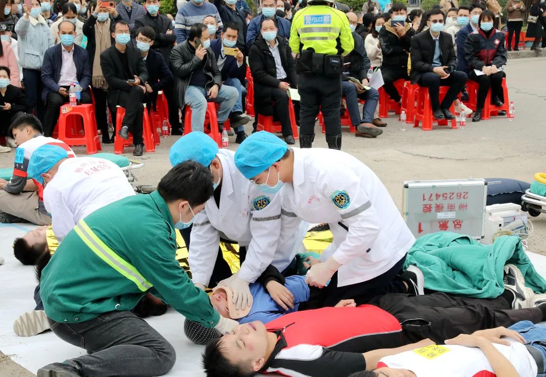 当天,莅临现场观摩指导的领导和专家有:柳州市人民政府二级巡视员袁燕珍、柳州市卫生健康委员会副主任胡学林、柳州市柳南区人民政府副区长曾德良、柳州市交通学校党委书记廖增勇、柳州市公安局治安警察支队教导员周建明、柳州市医疗急救指挥中心主任黄卓毅、柳州市公安局交通警察支队副队长黄柳;以及柳州市各县、区卫健局分管应急工作的领导;柳州市各急救站(点)分管副院长、医务部门负责人、急诊科主任、护士长、业务骨干。