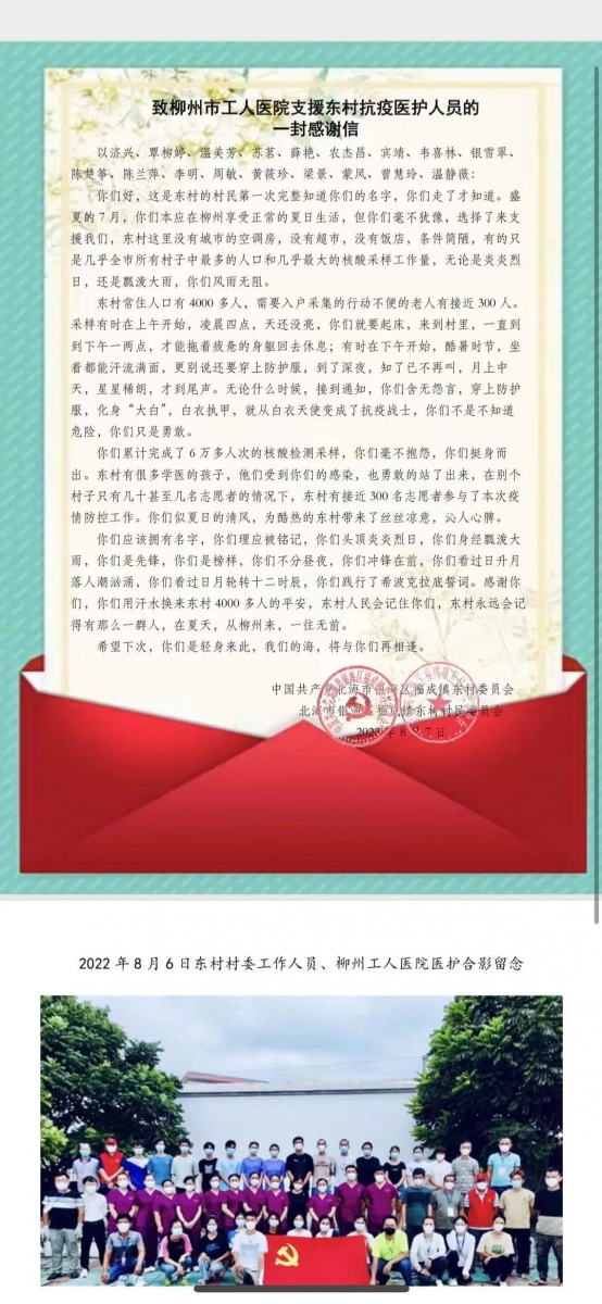 “盛夏的 7 月,你们本应在柳州享受正常的夏日生活,但你们毫不犹豫,选择了来支援我们。东村这里没有城市的空调房,没有超市,没有饭店,条件简陋,有的只是几乎全市所有村子中最多的人口和几乎最大的核酸采样工作量,无论是炎炎烈日,还是瓢泼大雨,你们风雨无阻”……