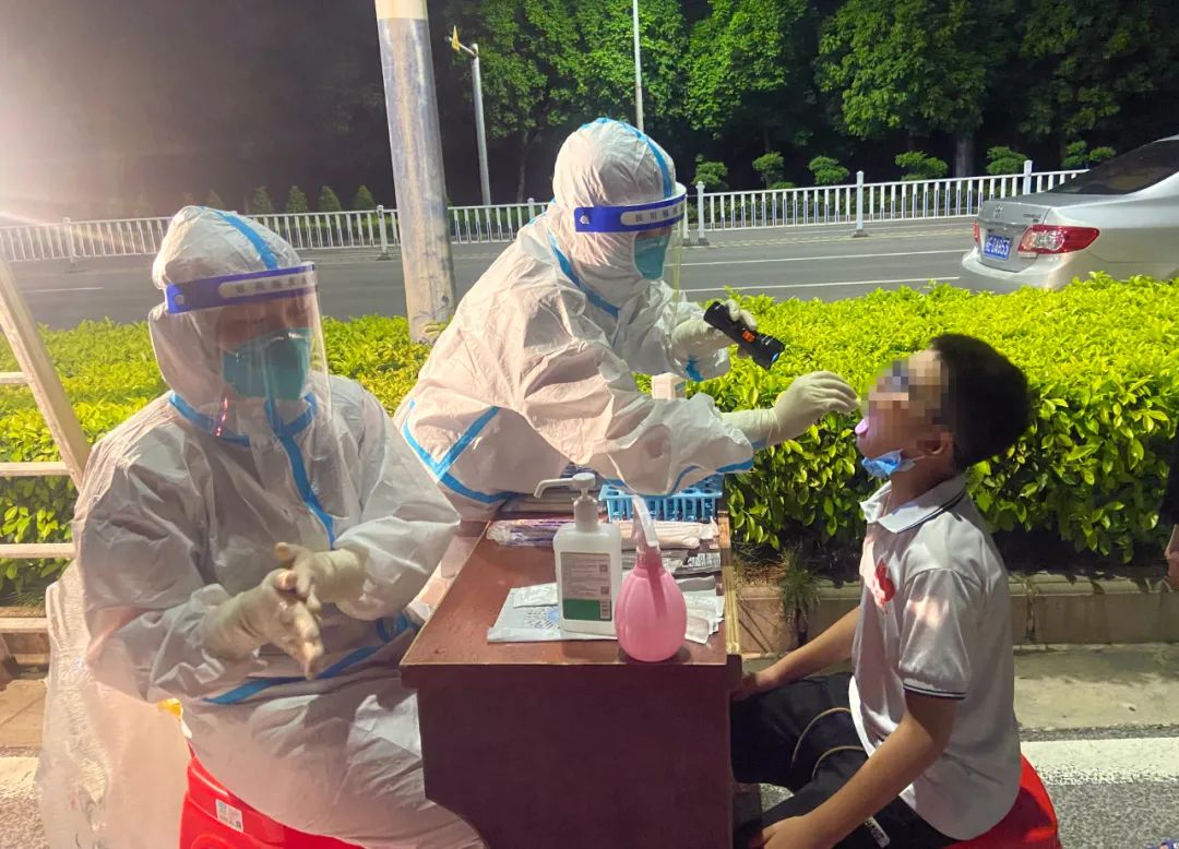 7月17日,柳州市工人医院核酸采样队在北海市银海区新村社区执行采样任务