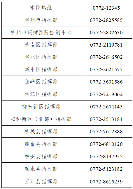 柳州市县两级疫情防控咨询热线电话