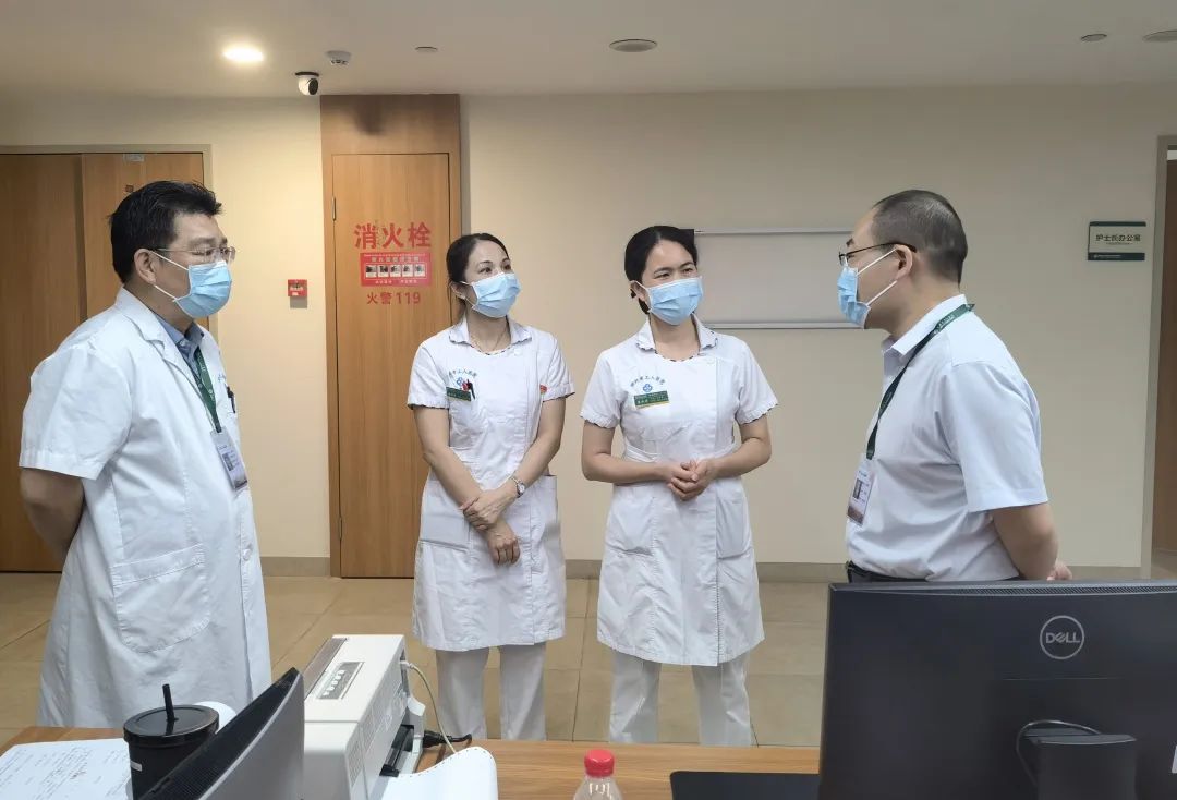 副院长谢湘涛、医务部副部长朱光炜认真聆听病区国庆假期应急预案