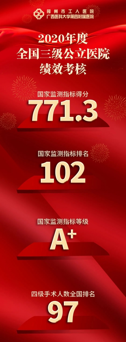 刚刚,2020年度国家三级公立医院绩效考核结果正式公布,柳州市工人医院在全国2508家三级公立医院中位列全国102名,连续三年进入A+队列,稳居全国三级公立医院前10%!