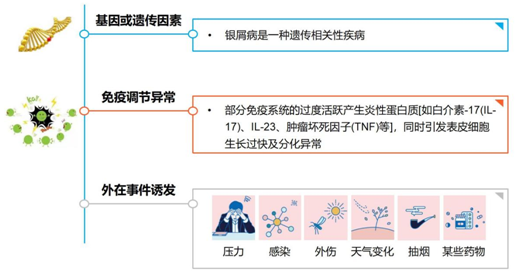 银屑病是遗传与环境共同作用诱发的慢性、复发性、炎症性、系统性疾病,不仅有皮肤症状,还会累及关节、头皮、指甲、掌跖等部位,不具有传染性。压力、感染、外伤、天气变化、抽烟酗酒、某些药物等都可诱发银屑病。