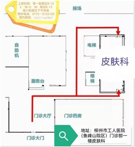 地址:柳州市柳石路1号工人医院(鱼峰山院区)门诊部1楼皮肤科门诊