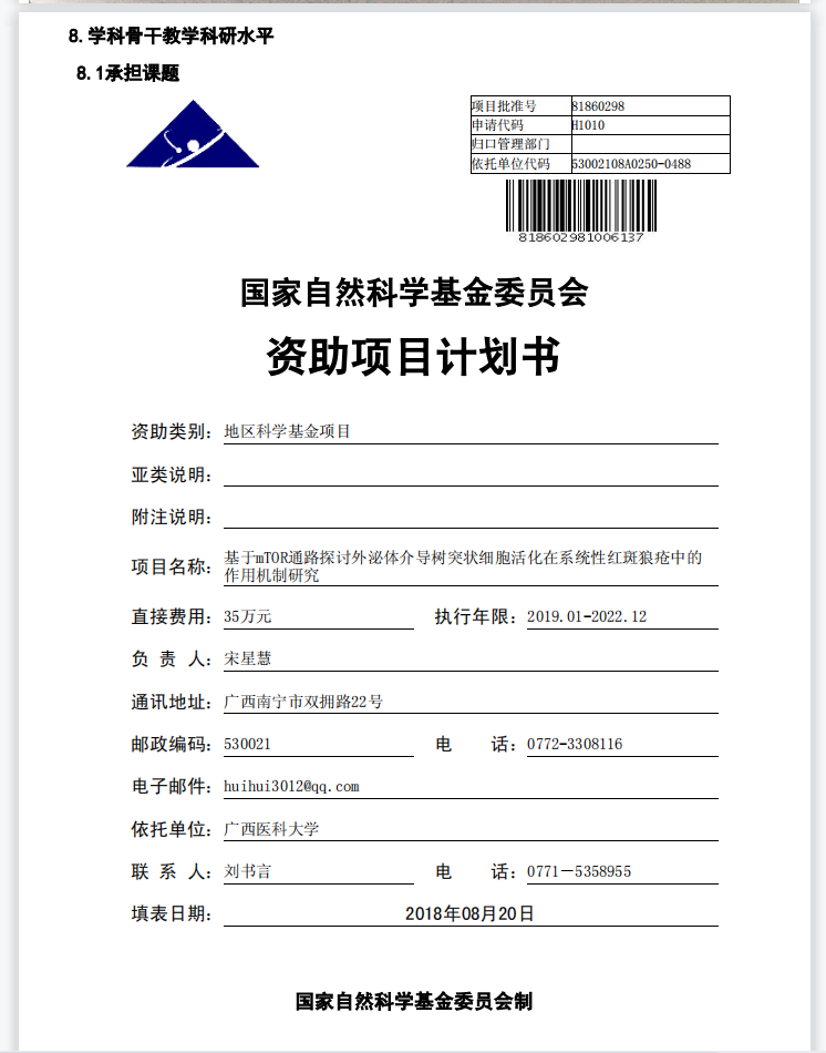 1、广西区内地市级医院风湿免疫科中第一家获得国家自然科学基金项目。目前科室获得1项国家自然科学基金、2项自治区自然科学基金、柳州市科技攻关项目,以及多项区级、市级课题,总科研经费达200多万元。近5年发表SCI论文10篇、核心论文多篇。