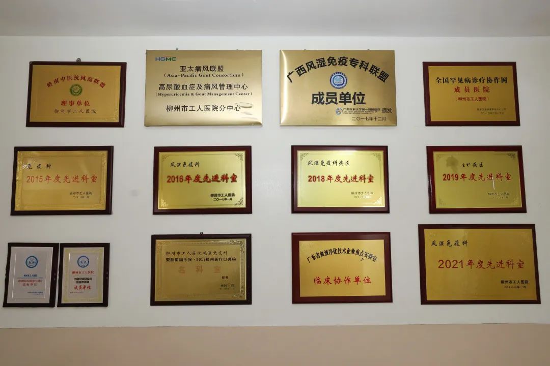 同时,柳州市工人医院风湿免疫科是柳州市医学会风湿病分会主委单位;广西自治区临床重点专科;亚太痛风联盟高尿酸血症及痛风管理中心柳州市工人医院分中心;中国风湿免疫病医联体联盟成员单位;广西风湿免疫专科联盟成员单位;全国罕见病协助单位;广东省血液净化技术企业重点实验室临床协作单位;岭南中医抗风湿联盟理事单位;临床药物试验(GCP)研究中心;广西医科大学研究生校外培养基地,目前培养硕士研究生2人。