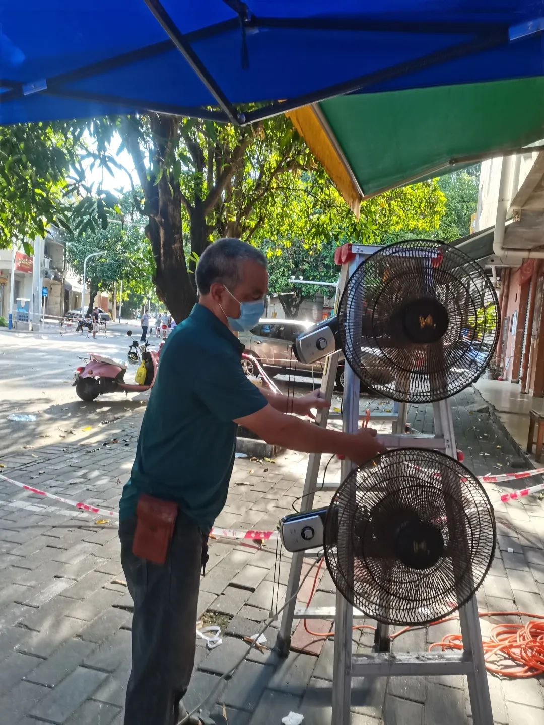 居民从家里拿了各式电风扇给采样队员们吹,凉快又暖心!
