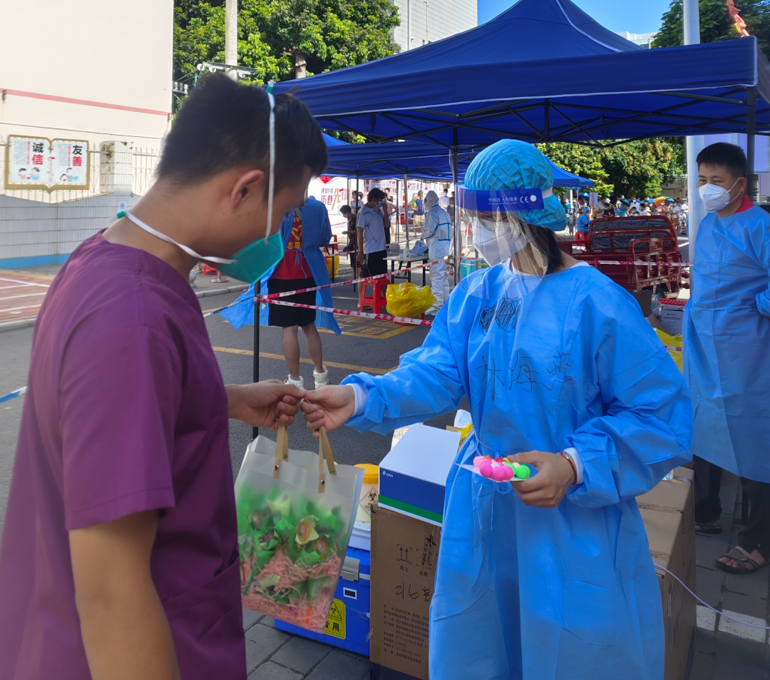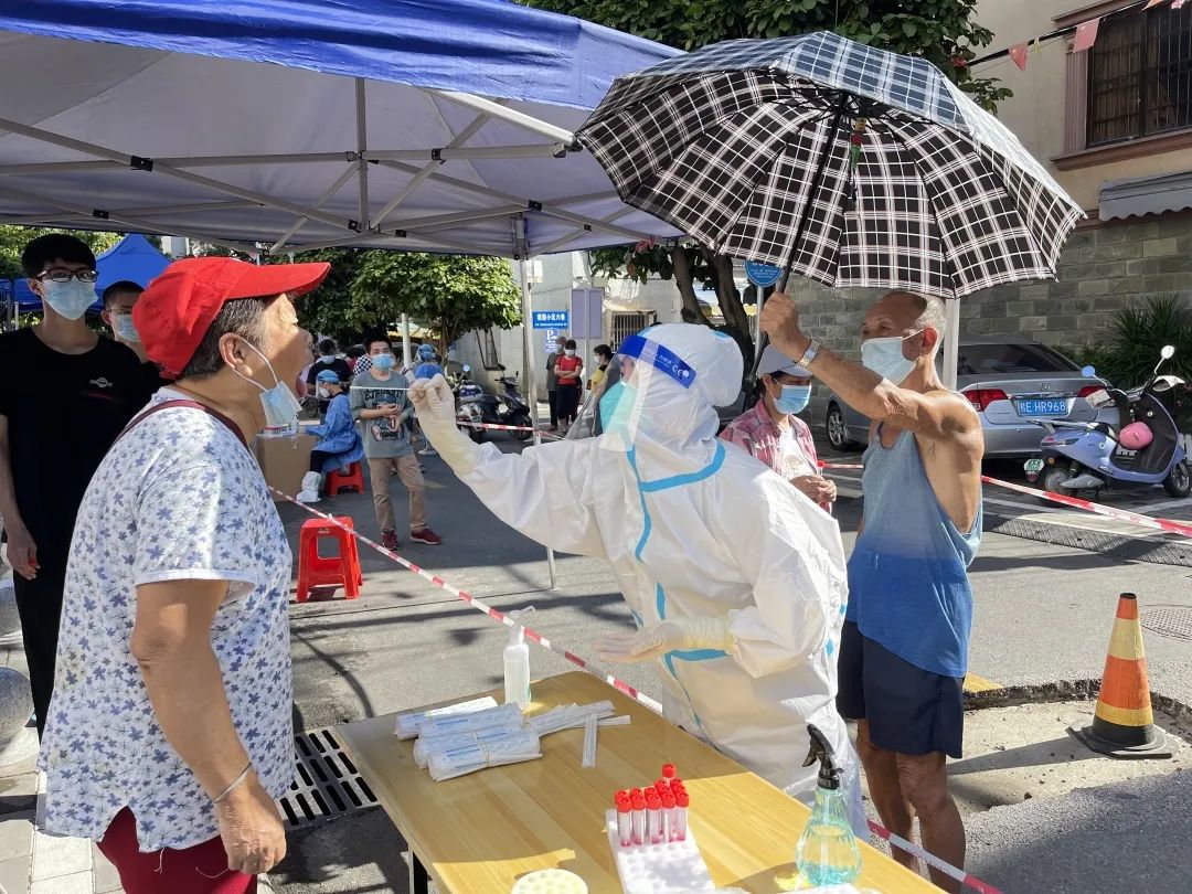 7月23日早上8点,队员们正在为北部湾东社区的居民们采集核酸,随着时间的推进,烈日当头,队员冉茂娇身着厚重的防护服,仍然坚持岗位,这时,一位老大爷为她打起了伞,自己却暴露在阳光下。那一刻,冉茂娇和队友们破防了……