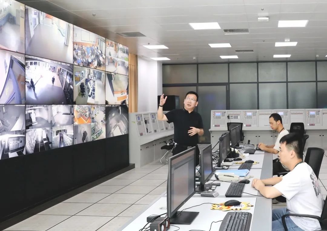 朱亚东(左)在向来访交流同行介绍“安消防一体化智慧系统”