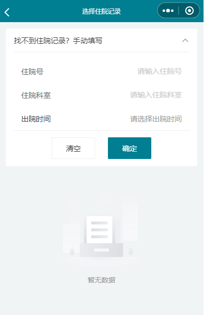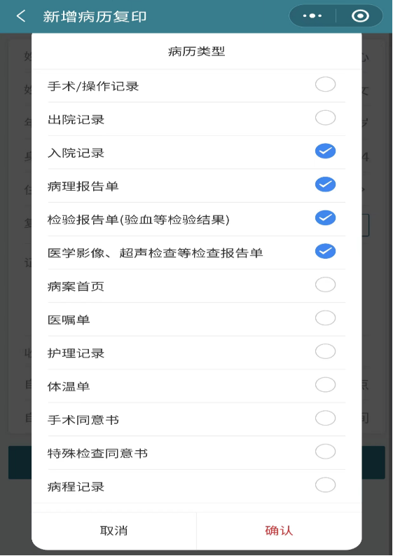 阅读复印须知,勾选“已阅读”→“确定”→“发起新申请”→选择住院号(已出院才能选择);如未找到,点击“手动填写”,“确认”→ 复印清单点击“添加”→选择需要复印的病历类型,点击“确认”, 可以增减份数,如果不想打印某个项目,在“添加”中取消勾选。