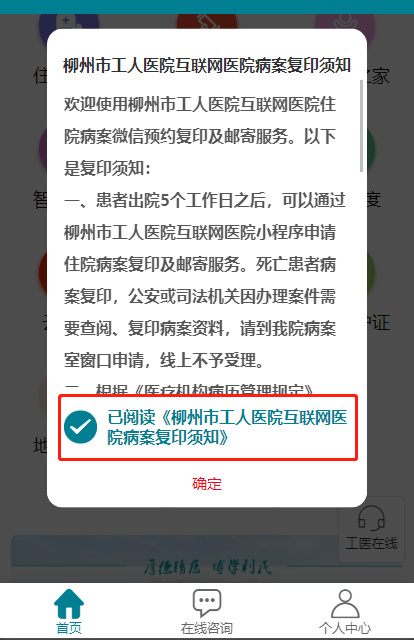 一、患者出院5个工作日之后,可以通过柳州市工人医院互联网医院微信公众号申请住院病案复印及寄递服务。死亡患者病案复印,公安或司法机关因办理案件需要查阅、复印病案资料,请到我院病案室窗口申请,线上不予受理。