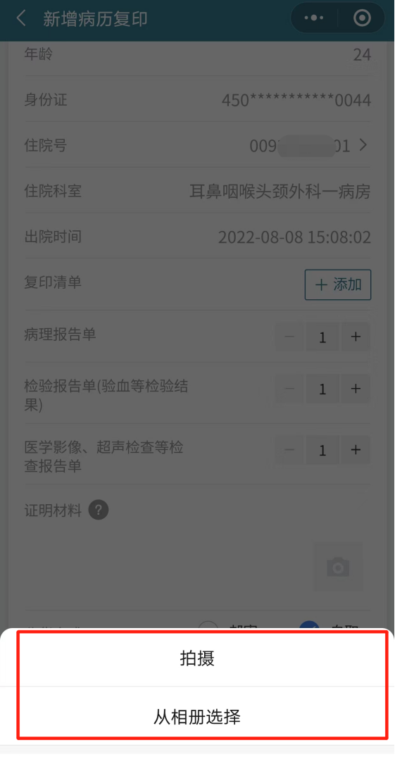 (3)身份证明材料可以现场拍摄或从相册选择,为保证复印病历申请顺利通过,请按照平台提示认真上传真实的、完整的、标准的相关身份证明材料。