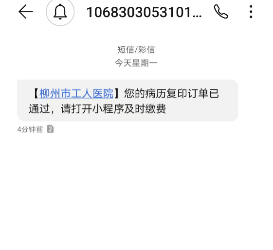 审核通过后会有手机短信提醒,进入微信公众号病案复印申请页面,点击“去支付”,使用微信支付。