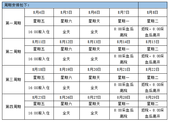 (2)每位志愿者需要完成4个周期项目,体格筛查前3天需保证良好的生活作息和饮食习惯(如早睡、不做剧烈运动、不大量食用海鲜、动物内脏等);