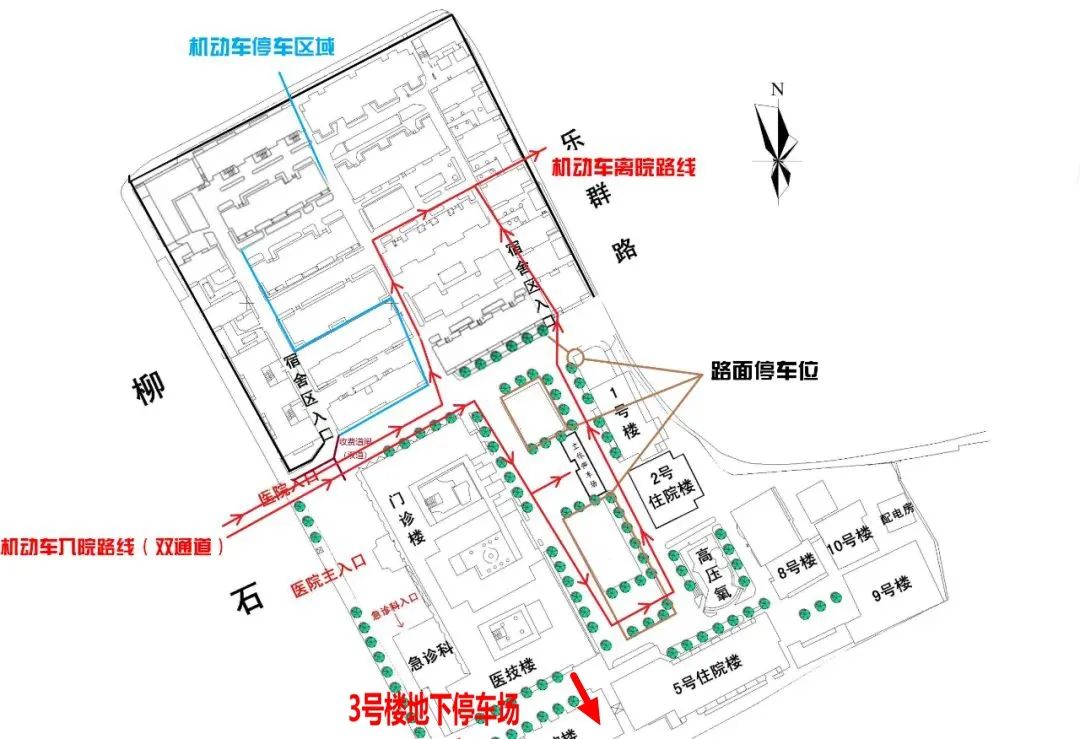 3号楼地下停车场:车位约80个,从柳石路医院3号门(靠六中)进出。