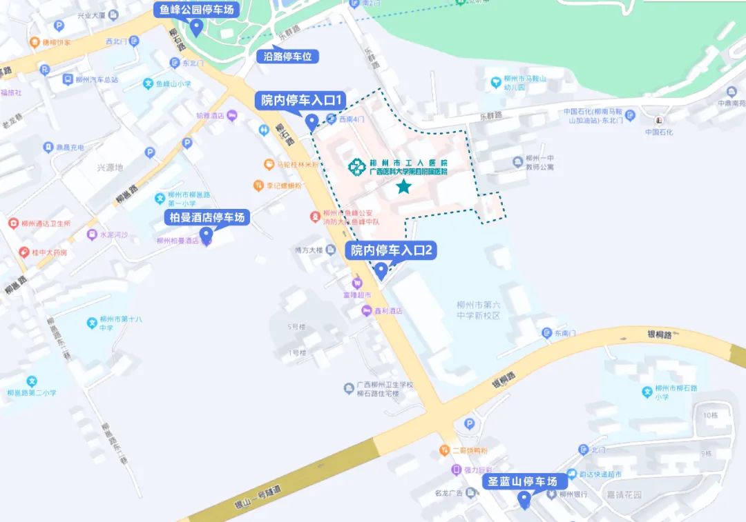 鱼峰山公园后门路面停车位:位于乐群路,按柳州市城市道路智慧停车收费标准收费,距离我院门诊约150米。