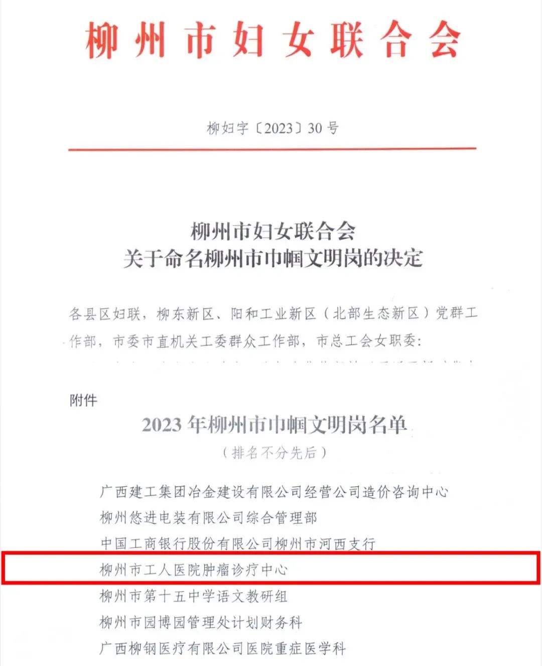 近日,柳州市妇女联合会印发《关于命名柳州市巾帼文明岗的决定》(柳妇字〔2023〕30号),柳州市工人医院肿瘤诊疗中心(以下简称“中心”)荣获2023年“柳州市巾帼文明岗”荣誉称号。