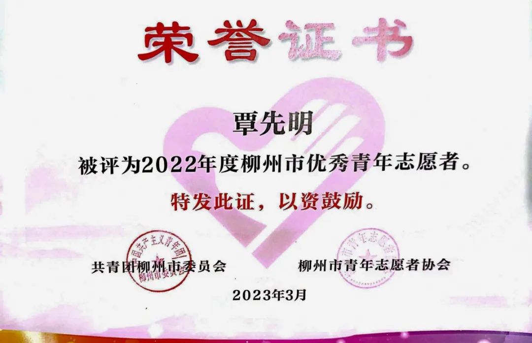 3月5日,由共青团柳州市委员会、柳州市青年志愿者协会共同举办的2022年度柳州市青年志愿者优秀个人奖、组织奖、项目奖颁奖仪式在雀儿山公园红豆广场举行,我院报送的“全民健康大讲堂”项目荣获“优秀青年志愿服务项目”奖,预防保健科覃先明同志获评为2022年度柳州市青年志愿者优秀个人。