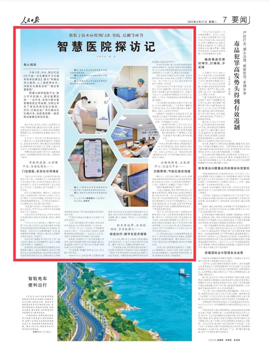 2023年6月27日,《人民日报》7版头条以《智慧医院探访记》为题报道了柳州市工人医院按照智慧医疗、智慧服务、智慧管理等标准,持续推进智慧医院建设,将数字技术应用到门诊、住院、后勤等各个环节,为患者提供更为便捷的医疗服务的实践和探索。