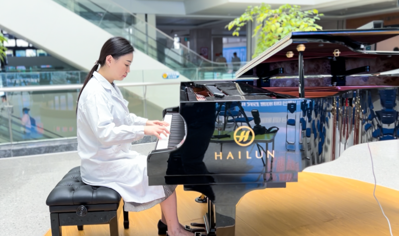 为了给患者创造优美舒适的就医环境,医院在门诊中庭设置了钢琴。图为医院医务人员在为患者演奏。优美的琴声可以缓解患者在就医过程中紧张、焦躁的情绪。