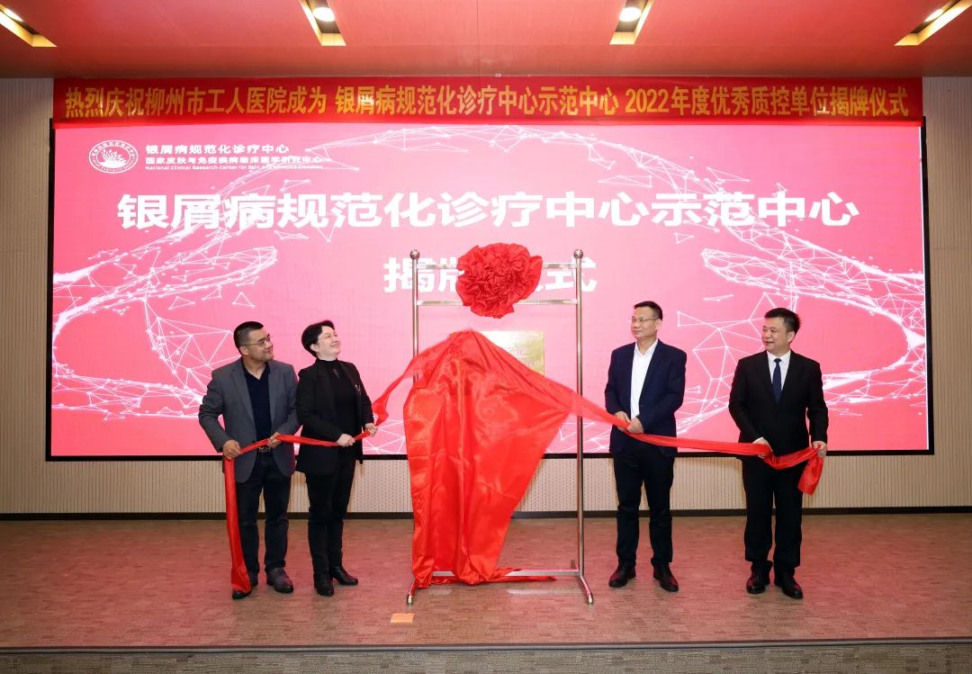 南方医科大学深圳医院梁燕华教授(左一)、柳州市工人医院院长黄海欣(右二)、副院长侯培勇(右一)、皮肤科主任肖文(左二)为国家级“银屑病规范化诊疗中心示范中心”揭牌