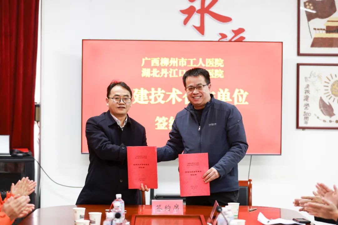 柳州市工人医院党委书记黎荣山(左)与丹江口市中医医院党委书记王亚东签约。