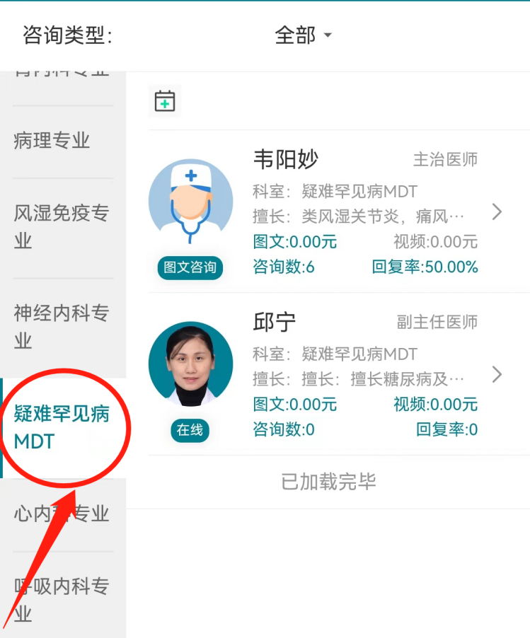 在互联网医院中选择在线咨询;请选择疑难罕见病门诊,如果您有明确专科倾向,可选择对应的专科,如果不知道应该选择什么专科,可以将病例提交给韦阳妙或者邱宁医师,他们会负责整理你们的资料,分发专家,必要时组织多学科会诊,甚至邀请国内知名教授为您解决,提供一站式的服务。