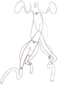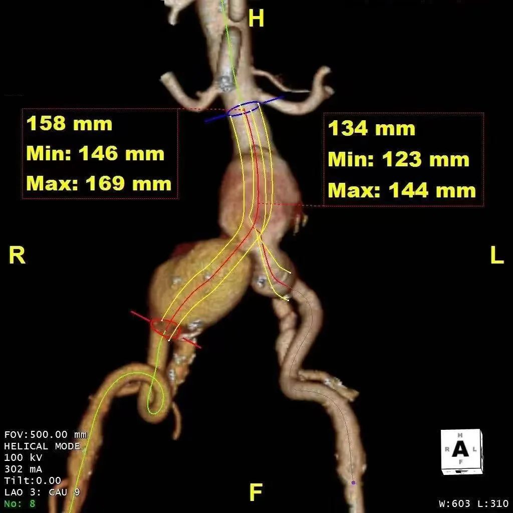 该病例系67岁的老年患者,诊断:腹主动脉瘤、双侧髂动脉瘤、瘤体内伴有附壁血栓。病变解剖复杂,且累及双髂内动脉,为术者团队提出诸多挑战,而该患者既往因胸主动脉疾病已行胸主动脉腔内修复(TEVAR)+左锁骨下动脉(LSA)原位开窗重建术,治疗挑战不断升级。团队需要认真思考讨论并解决诸多的难点:1.完全隔绝腹主动脉及髂动脉病变;2.如何避免因胸腹主动脉长段隔绝后的截瘫风险;3.如何解决LSA原位开窗后手术入路受限问题。