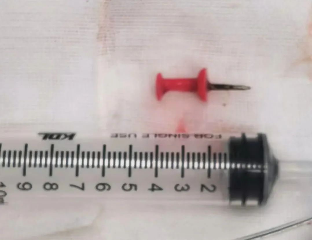 劳主任凭借丰富的经验和娴熟的技术,经过不断更换取异物的工具,变换铁钉方向,避免铁钉卡住气管,历时一个小时,才将异物取出,大家都捏了一把汗。